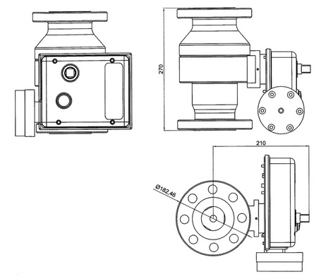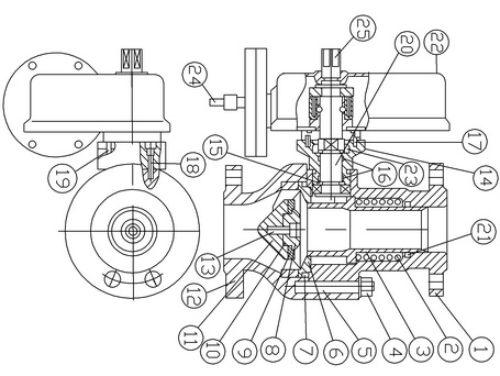 1.Выходной фланец; 2.Пружина; 3.Клапан; 4.Гайка; 5.Шпилька; 6.Кольцо; 7.Уплотнительное кольцо; 8.Стопор уплотнения; 9.Уплотнение; 10.Уплотнительное кольцо; 11.Держатель уплотнения; 12.Входной патрубок; 13.Винт; 14.Втулка; 15.Уплотнительное кольцо; 16.Антифрикционное кольцо; 17.Опорный ролик; 18.Винт; 19.Винт; 20.Блок вала; 21.Уплотнительное кольцо; 22.Пилот; 23.Кольцо стопорное; 24.Импульсная линия; 25.Пускной вал