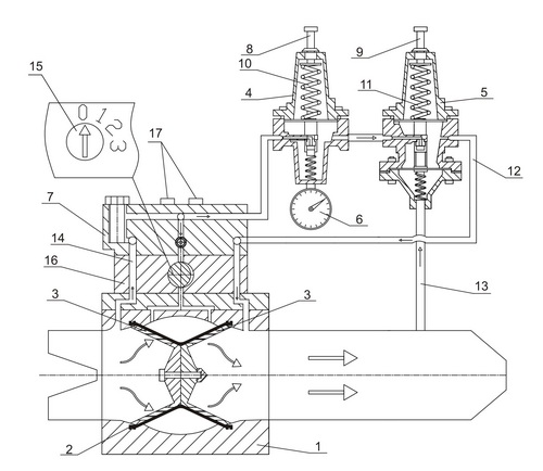 1.Корпус; 2.Манжета; 3.Плунжерная решетка; 4.Корпус стабилизатора; 5Корпус пилота; 6.Манометр; 7.Распределитель; 8.Регулировочный винт стабилизатора; 9.Регулировочный винт пилота; 10.Пружина стабилизатора; 11.Пружина пилота; 12.Линия сброса; 13.Импульсная линия; 14.Импульсный канал; 15.Дроссель; 16.Дроссельная камера; 17.Заглушка.