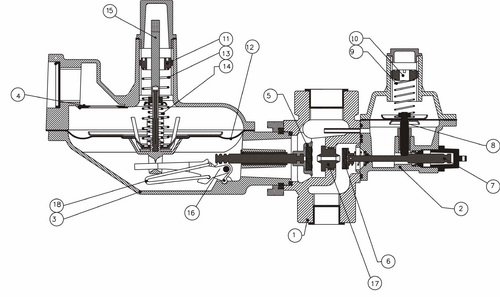 1) Корпус; 2) Предохранительный клапан отсекатель; 3) Регулирующая камера; 4) Узел предохранительного–сбросного клапана; 5) Клапан камеры; 6) Клапан предохранительного клапана отсекателя; 7) Затвор; 8) Узел мембраны предохранительного клапана отсекателя; 9) Пружина; 10) Регулирующая гайка предохранительного клапана-отсекателя 11) Регулирующая гайка; 12) Мембранный узел; 13) Пружина; 14) Пружина предохранительного – сбросного клапана; 15) Шток; 16) Собачка; 17) Сопло.