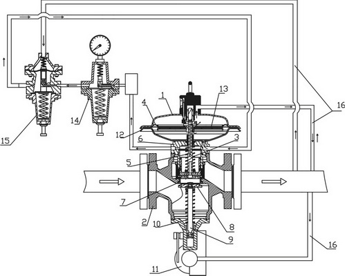 1. Корпус мембраны; 2. Корпус регулятора; 3. Шток; 4. Мембрана; 5. Пружина; 6. Переходный фланец; 7. Сопло клапана; 8. Клапан; 9. Нижний шток; 10. Нижняя пружина; 11. ПЗК; 12. Основание мембранной камеры; 13. Тарелка мембраны; 14. Стабилизатор; 15. Пилот; 16. Линия обратной связи.