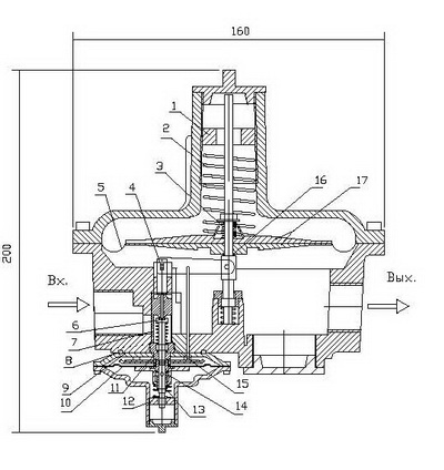 1.Регулирующая гайка; 2.Пружина настроечная; 3.Пружина ПСК; 4.Рычаг клапана; 5.Мембрана; 6.Клапан ПЗК; 7.Сопло; 8.Манжета; 9.Прокладка; 10.Мембрана ПЗК; 11.Сальник штока ПЗК; 12.Гайка ПЗК; 13.Пружина ПЗК; 14.Стопорные шарики; 15.Сальник; 16.Сальник ПСК; 17.Тарелка мембраны.